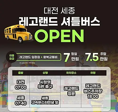 탑승장소는 대전은 시청역 5번 출구이고 세종은 고속버스터미널 앞에서 출발해 레고랜드 정문 앞에 도착합니다.