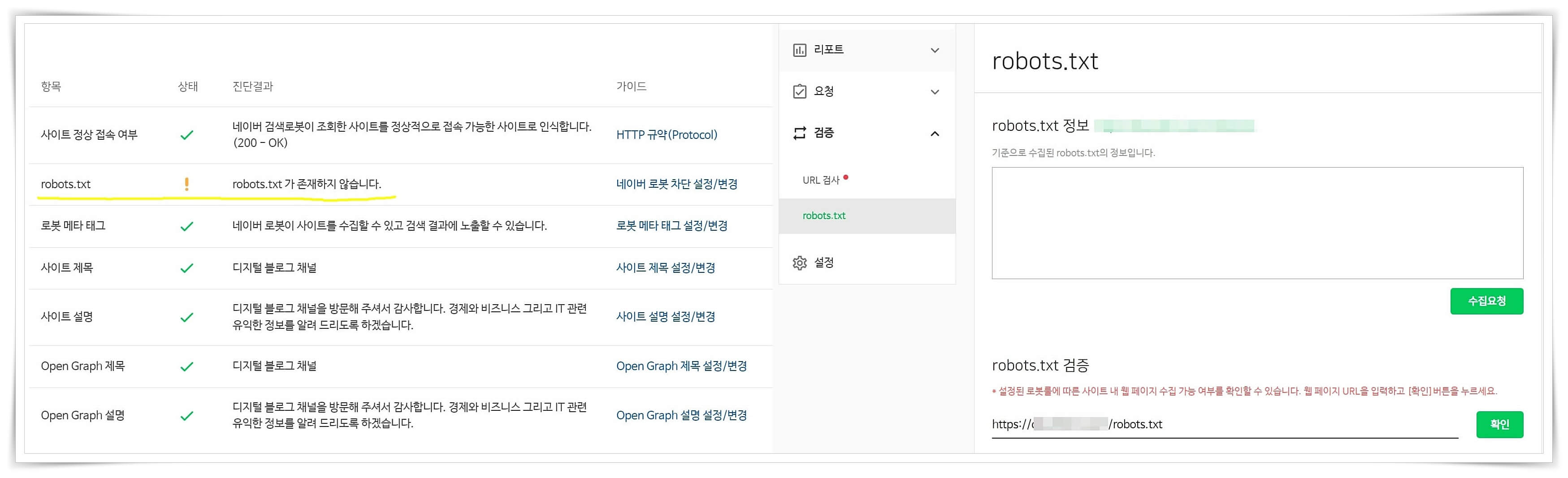 참고로, 서치 어드바이저에 블로그 주소를 입력해서 ROBOTS.TXT에러가 나오실 경우에는 아래와 같이 해보시기 바랍니다. robots.txt 탭으로 가셔서 검증 부분에 주소 입력/robots.txt를 입력하고 확인을 누르시면 "수집이 가능합니다"라는 팝업 메시지가 뜨게 됩니다. 그리고 위의 수집 요청을 눌러 주시면 됩니다.