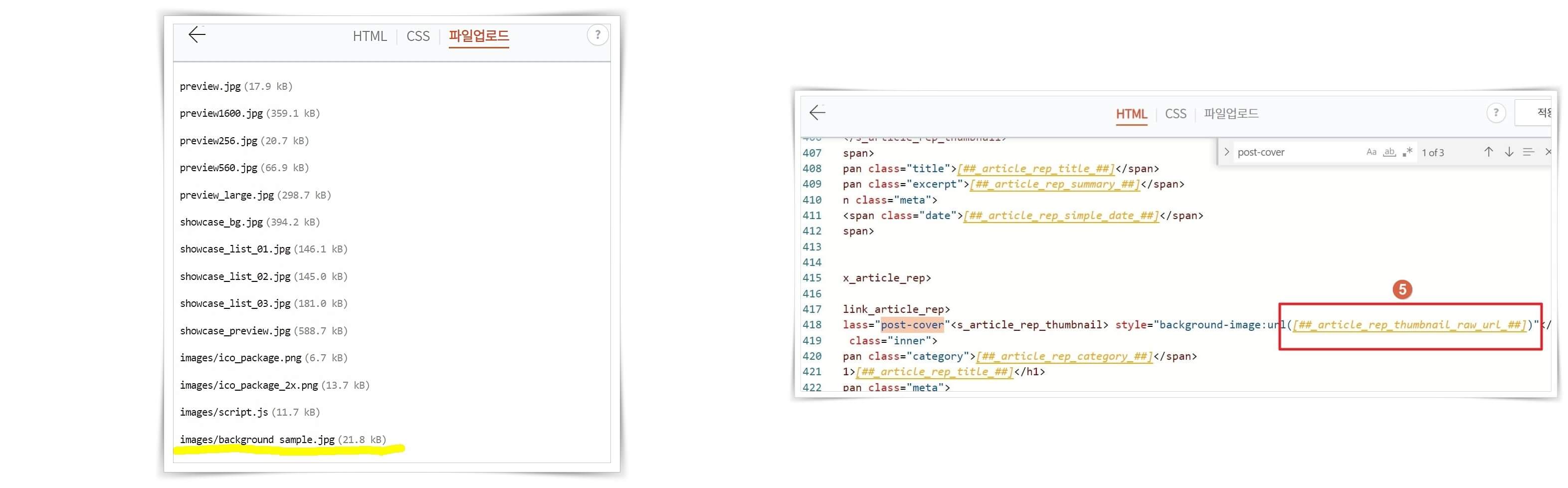 HTML탭으로 이동하셔서 Ctrl+F post-over를 찾으시면 418번대에 백그라운드 이미지가 참조하는 주소가 보이게 됩니다. 이 주소를 아까 복사해 둔 주소로 바꿔 주시고 적용과 새로고침을 눌러 주시기 바랍니다. 주소를 넣으실 때 url괄호 안의 [ ]까지 모두 지우시기 바랍니다.